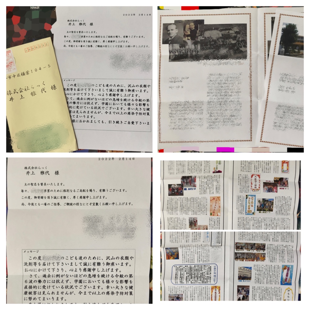 この度、定期的にご寄付を受け取って下さる福祉施設の施設長様から感謝のお手紙が届きました。