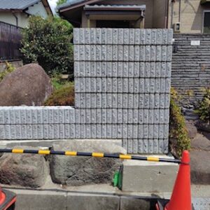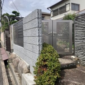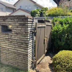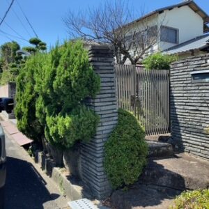 垣根の影響で門扉が傾いているので垣根をフェンスにリフォームします。