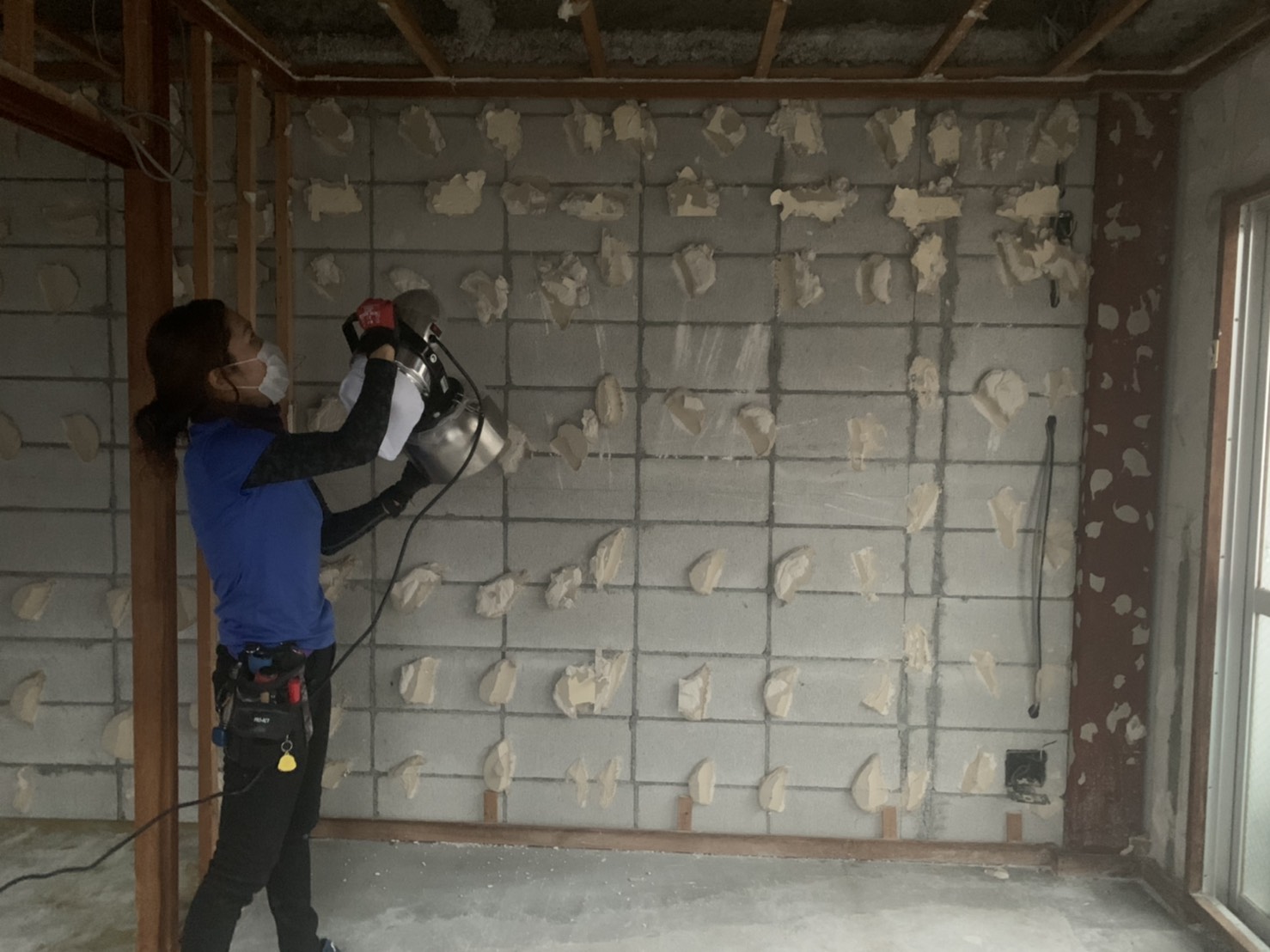 消臭作業前にリフォーム業者様と丁寧に打合せを行い、内装業者様に天井やクロス、梁など可能な限り取り外してもらい、『らっく』の協力会社様の、ハウスクリーニング業者様に床面の洗いをして頂き、その後に除菌消臭作業に入らせて頂きました。