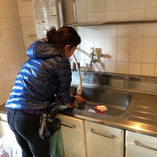 仕分け搬出後は女性スタッフで、お引渡しが気持ちよくできるよう、水まわりの汚れを掃除します。