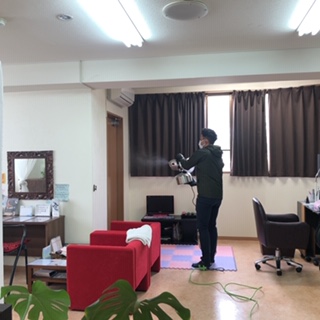 『らっく』の代表が店内空間の除菌抗菌消臭作業を進めます。