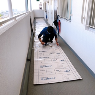 搬出経路の廊下も養生します。