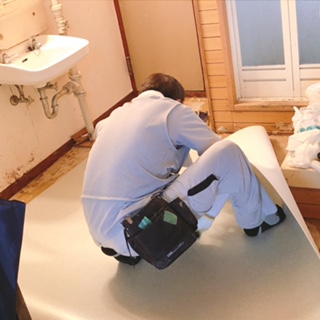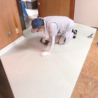 新しい床材の採寸と切断をします。