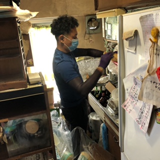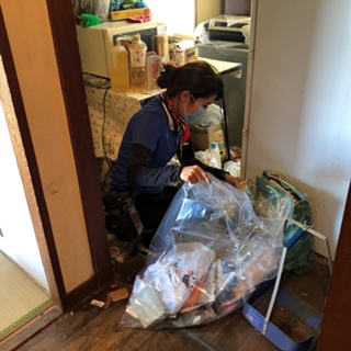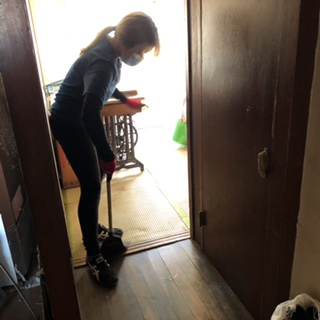 キッチンの足場を確保する為、床に散乱した生活雑貨類を片付けていきます。