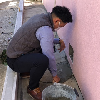 建物と床の隙間も丁寧にモルタルを塗っていきます。