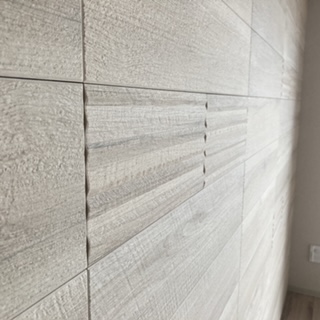 リビングの壁の一部はエコカラットにして凹凸をつけ個性ある空間に仕上げます。