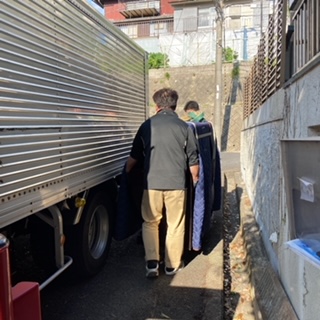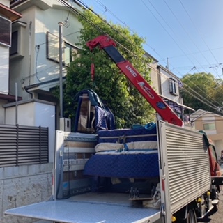 クレーンで吊り上げて下ろしたあとは、手運びでトラックに積み込みます。
