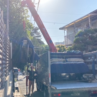 玄関外階段に後付けの手摺や茂った生木があるのでクレーン引き上げ搬出になります。