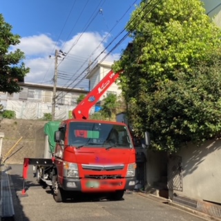 生木や屋根を傷つけないよう慎重に吊り上げます。