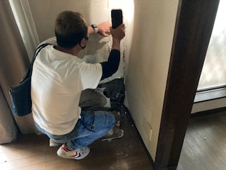 壁紙施工業者様が丁寧に壁の状態をチェックします。