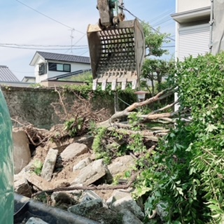 重機を使って外構から建物までの間にある庭の植木を取り崩していきます。