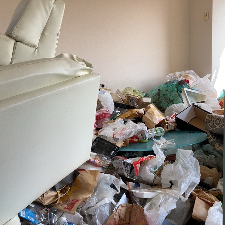 コンビニやファストフードのパッケージが散乱していました。