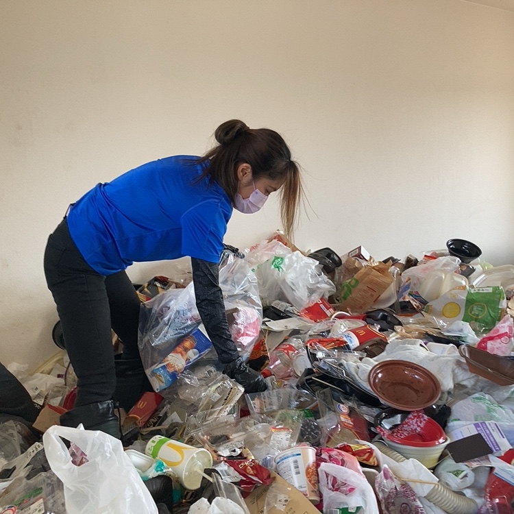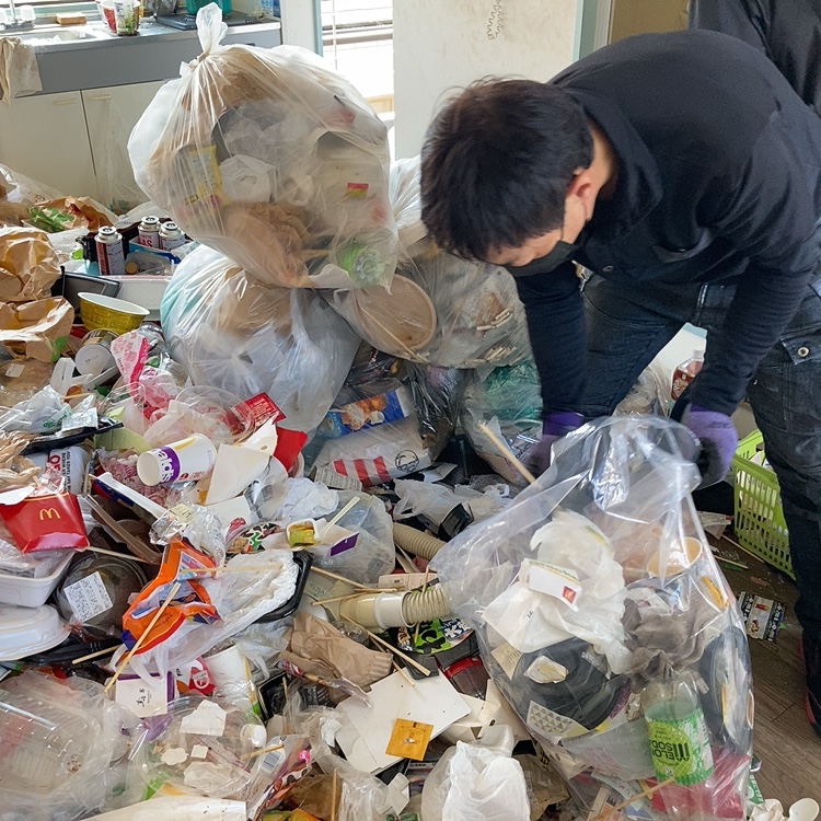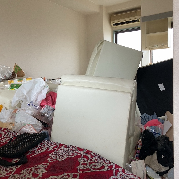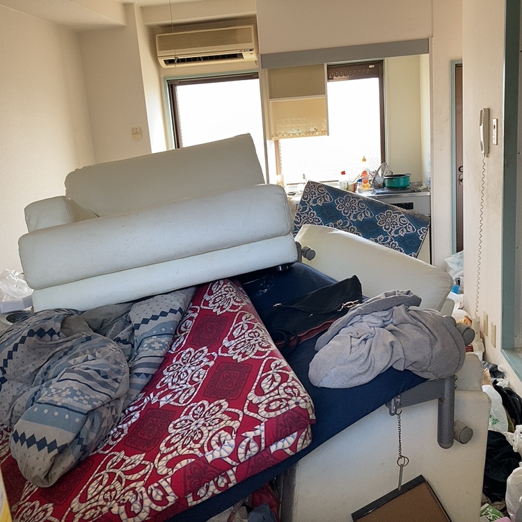 ベッドやソファを片づけて、室内に溢れ返った物を袋に纏めていきます。