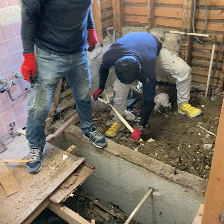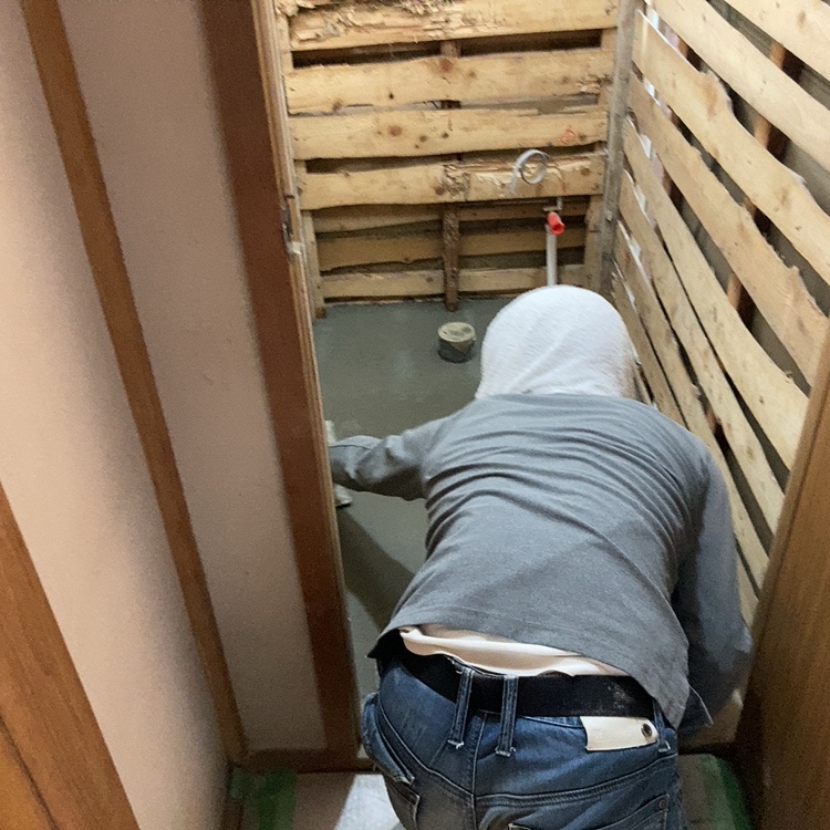 左官職人さんが丁寧にトイレの床を仕上げていきます。![]()